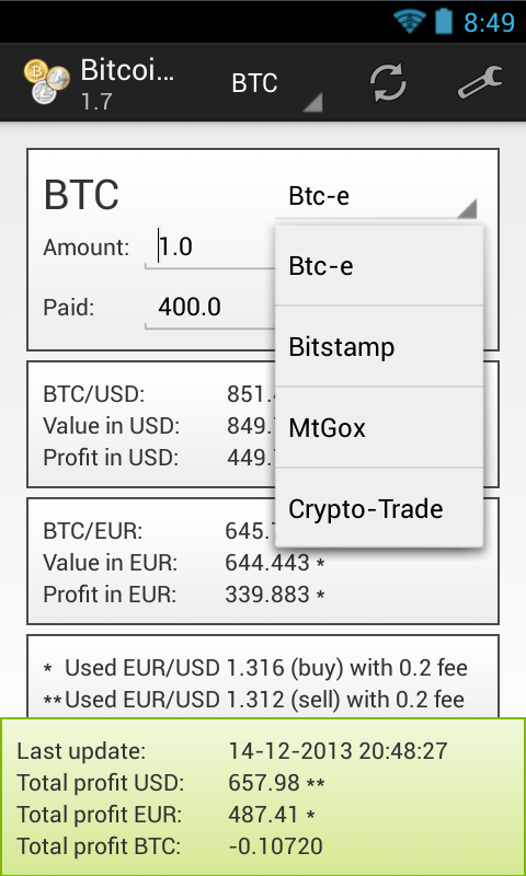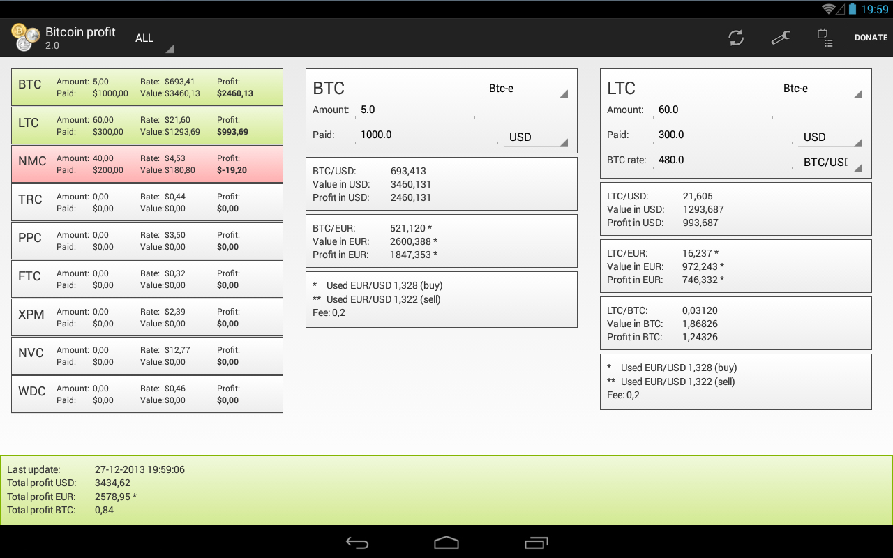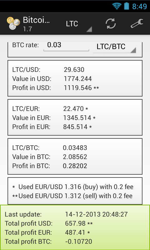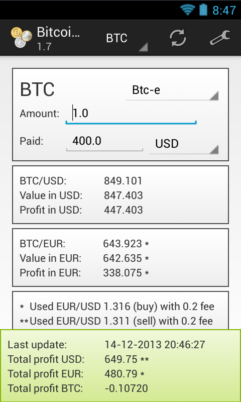 Calculate the profit for your Bitcoin, Litecoin, Namecoin and a lot of other altcoins. See the supported tab for the full list of supported coins. Fill in how many BTC, LTC, NMC, etc. you have and the price you've paid for it. The app calculates your profit using the API of several exchanges (also see the supported tab". The fee is considered in this calculation. The prices shown are the prices for which you can sell your coins. It is also possible to show your profit in bitcoins, to do so you need to fill in the price of one bitcoin at the moment you bought your alternate coin (the third input field). To make the app easier to use, the values you enter are stored. You can also view the history of your last 100 profits. To keep out the average user that borrows your phone from viewing your profit, you can now set a password as a simple protection.