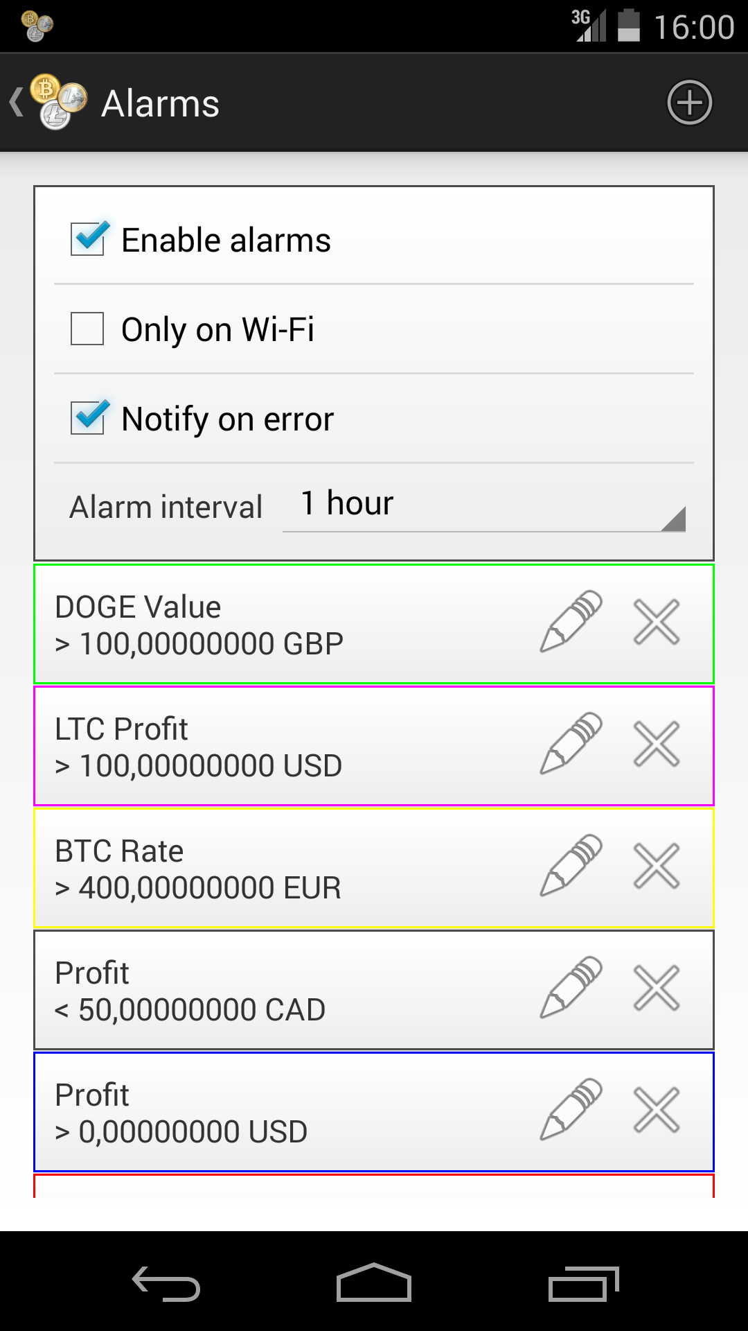 A donation can be made via in-app purchase or crypto currency. After a donation it is possible to set alarms and get notifications for your total profit and/or crypto currency rate/value/profit. Also adds can be removed after a donation.