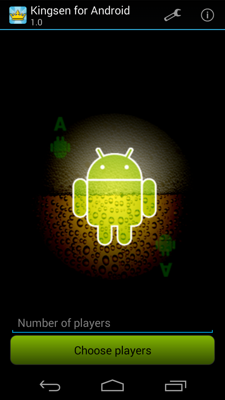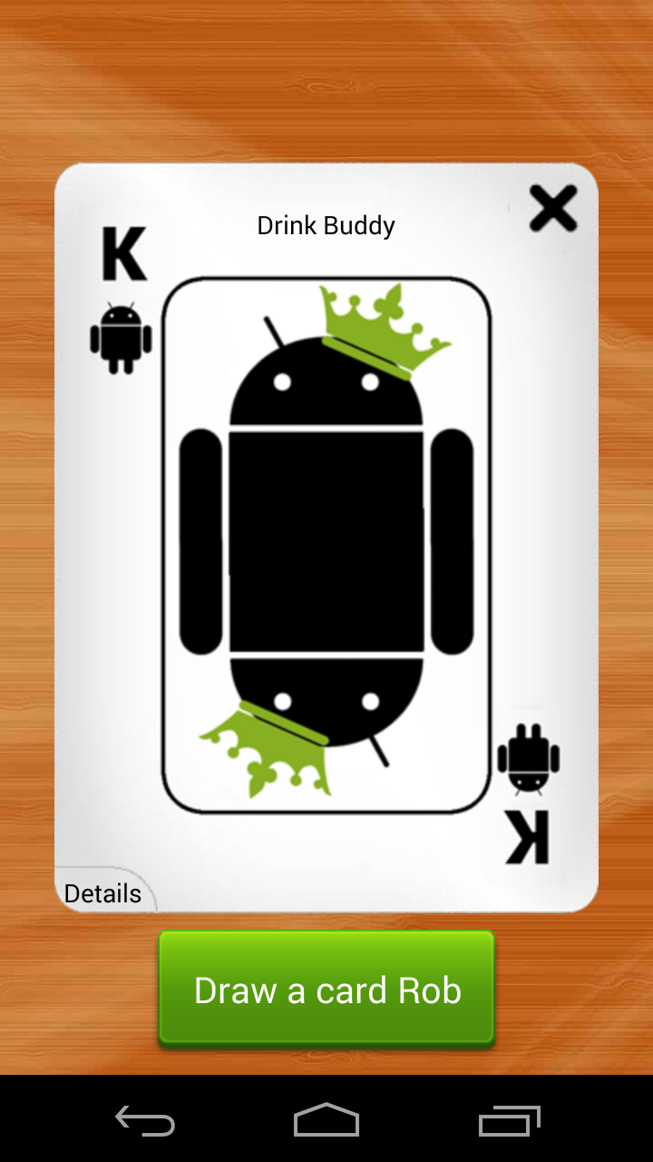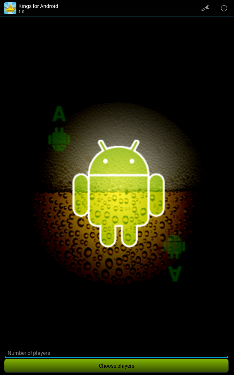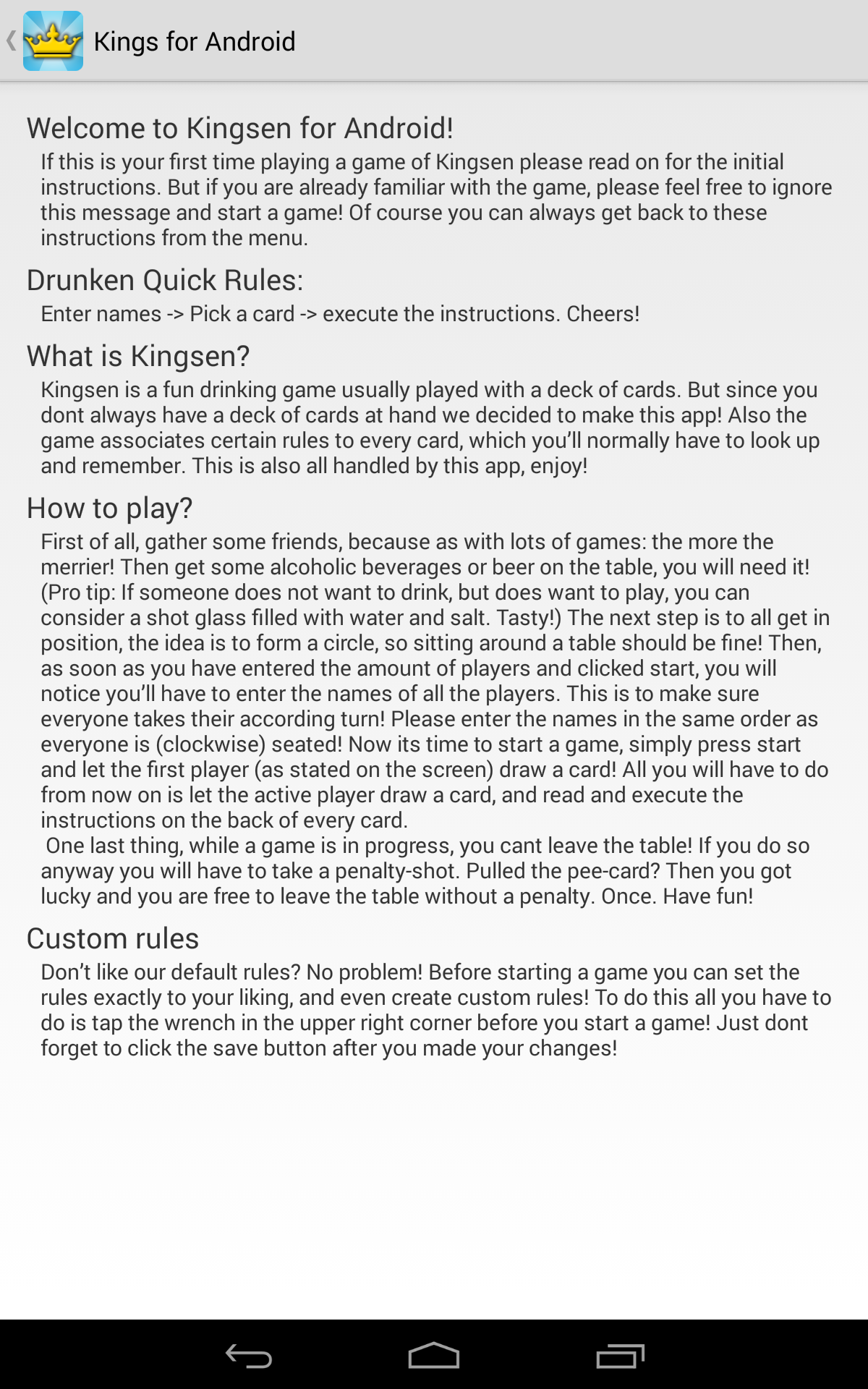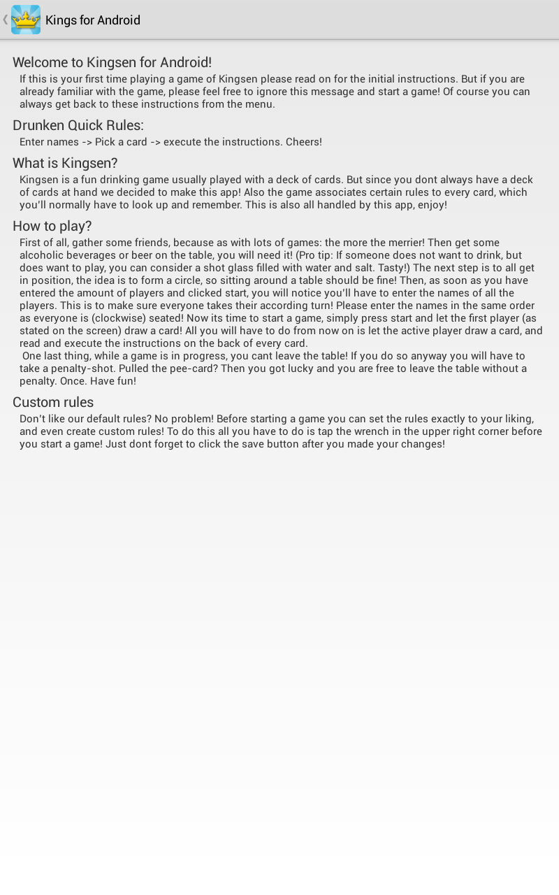 Kings for Android is the classic booze game brought back to life for your drinking pleasure! Compete with your friends using a single device! Simply enter the names of all the contestants, possibly edit the rules of the game, and start picking cards. For those who never heard of Kings, the game is based on a deck of cards. Every turn someone has to pick a card and perform the action that corresponds to this card (found on the back). All actions are related to taking a zip of booze so be prepared for a fun night!