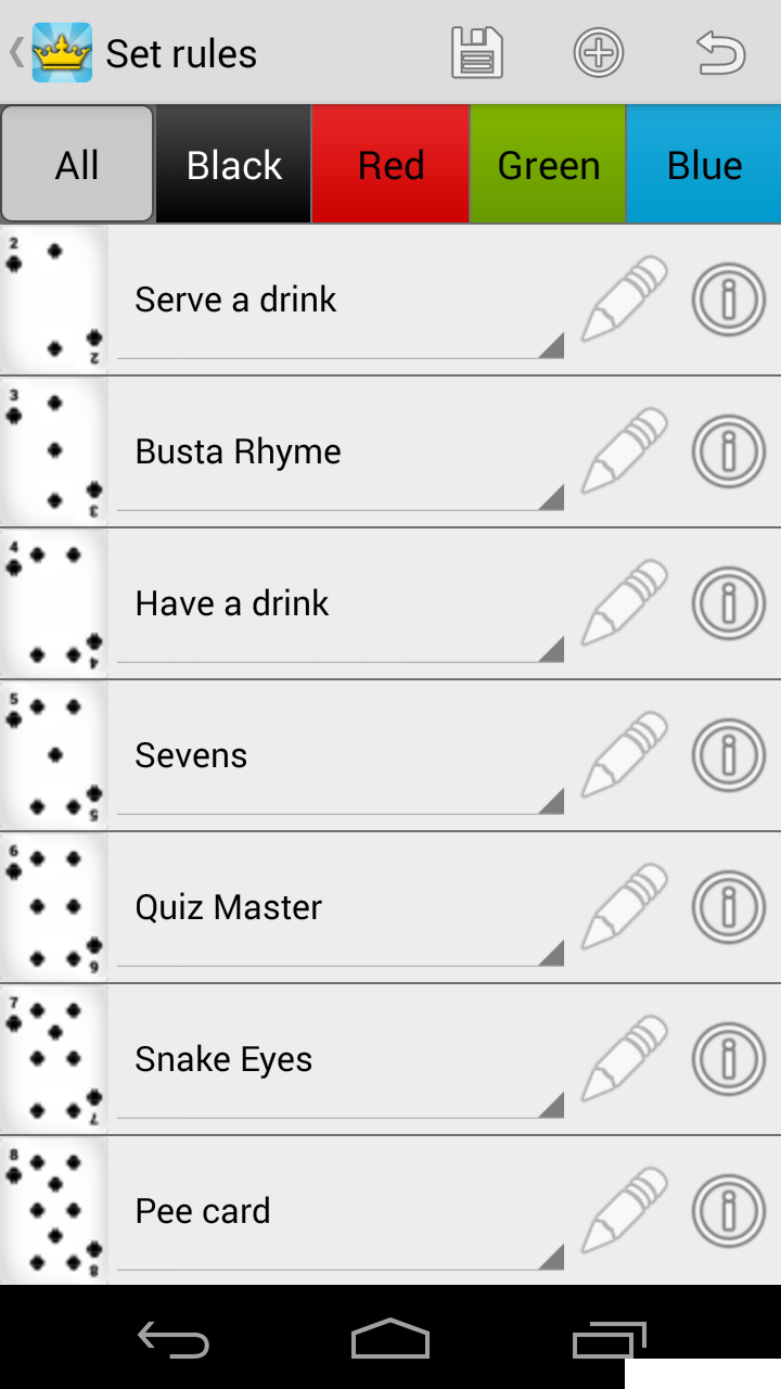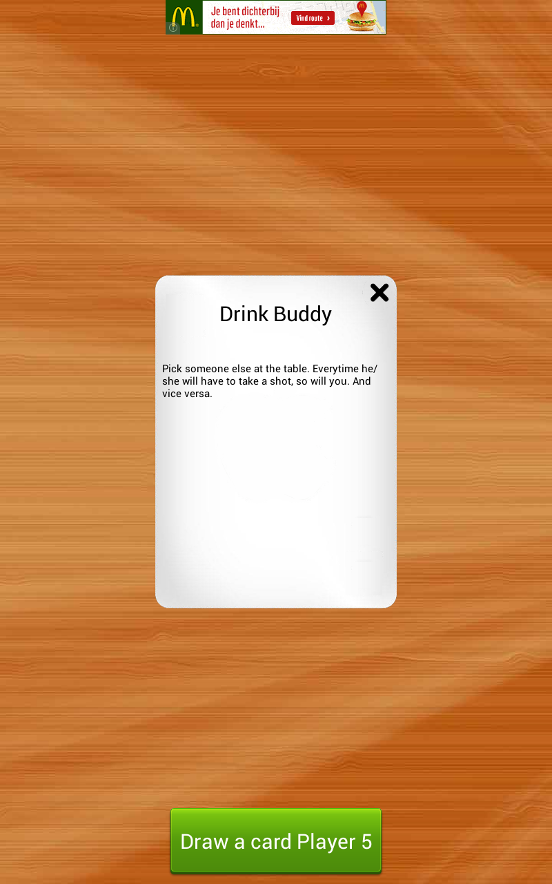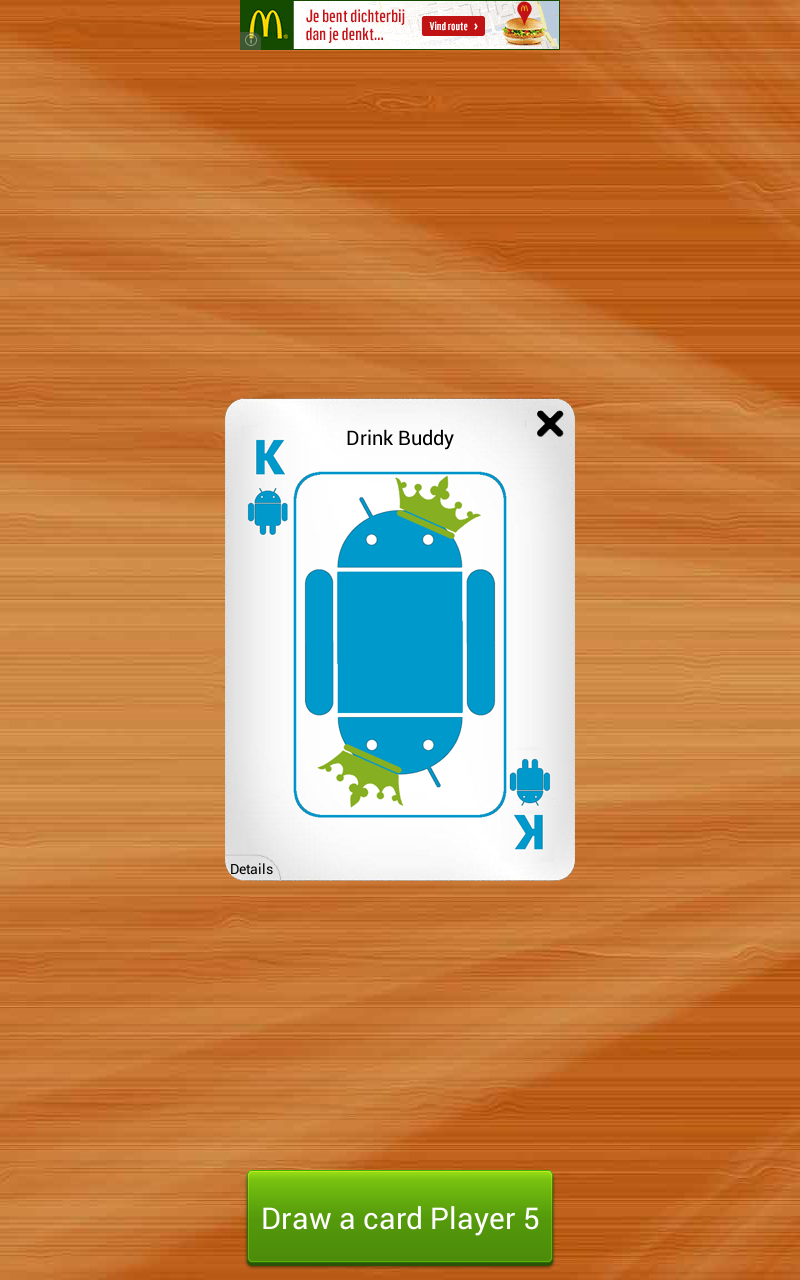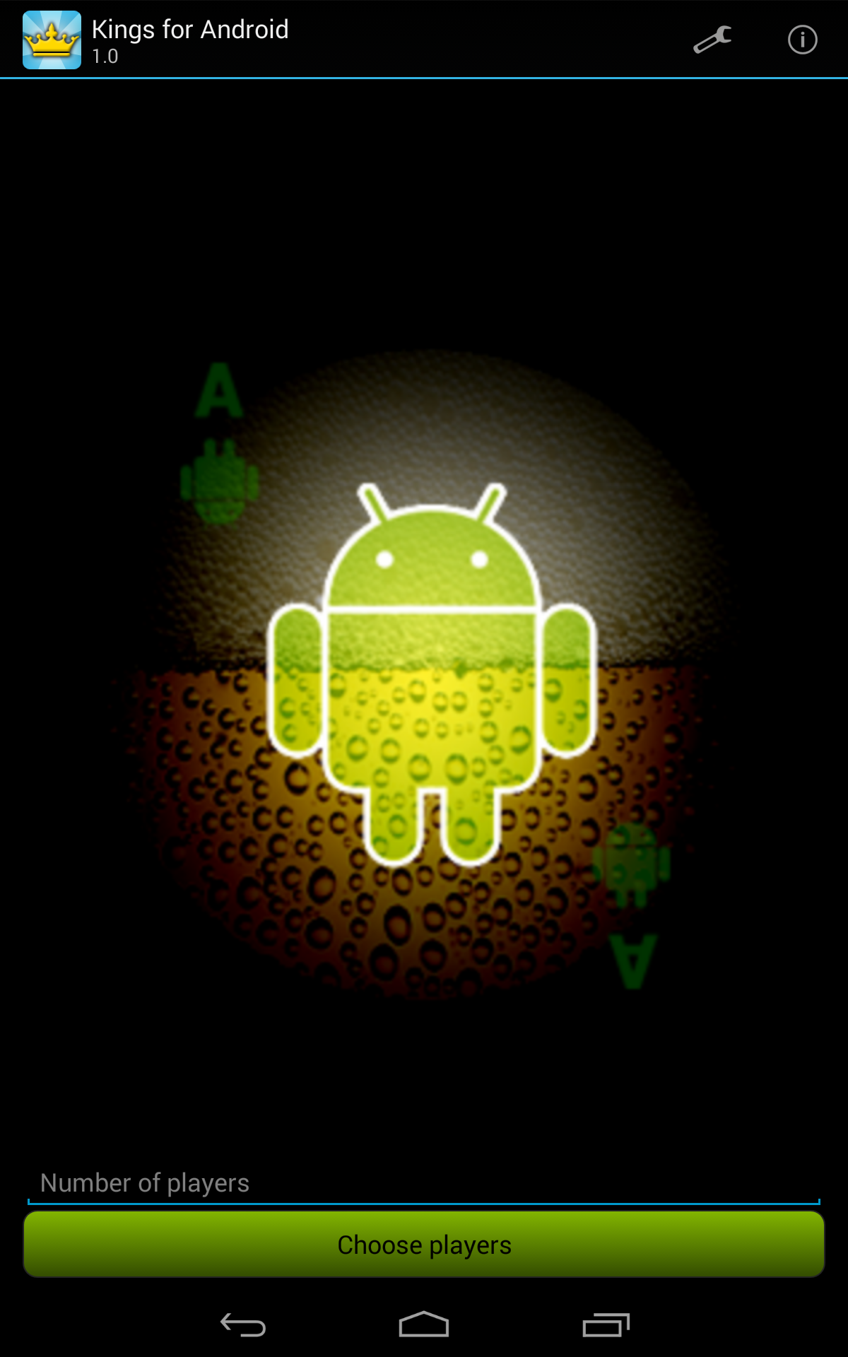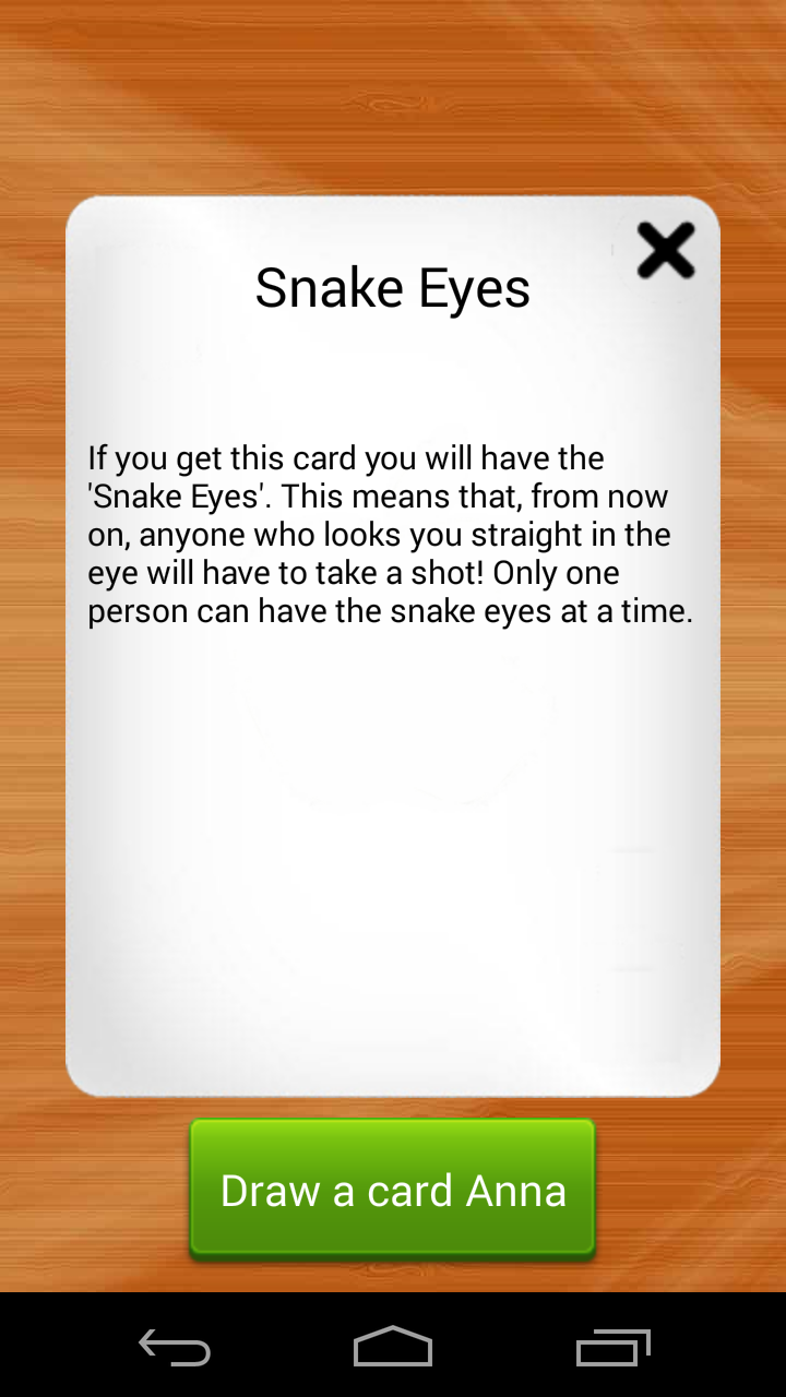 Kings for Android is the classic booze game brought back to life for your drinking pleasure! Compete with your friends using a single device! Simply enter the names of all the contestants, possibly edit the rules of the game, and start picking cards. For those who never heard of Kings, the game is based on a deck of cards. Every turn someone has to pick a card and perform the action that corresponds to this card (found on the back). All actions are related to taking a zip of booze so be prepared for a fun night!