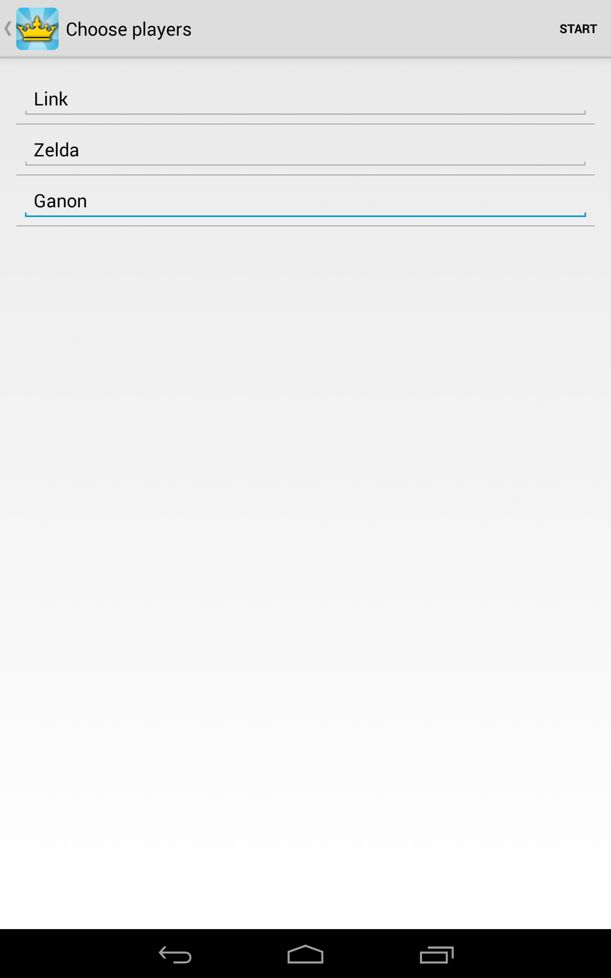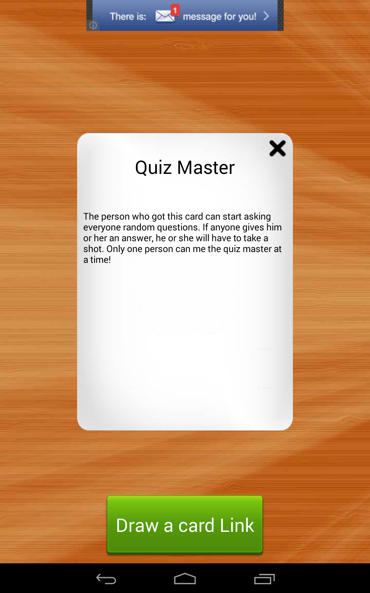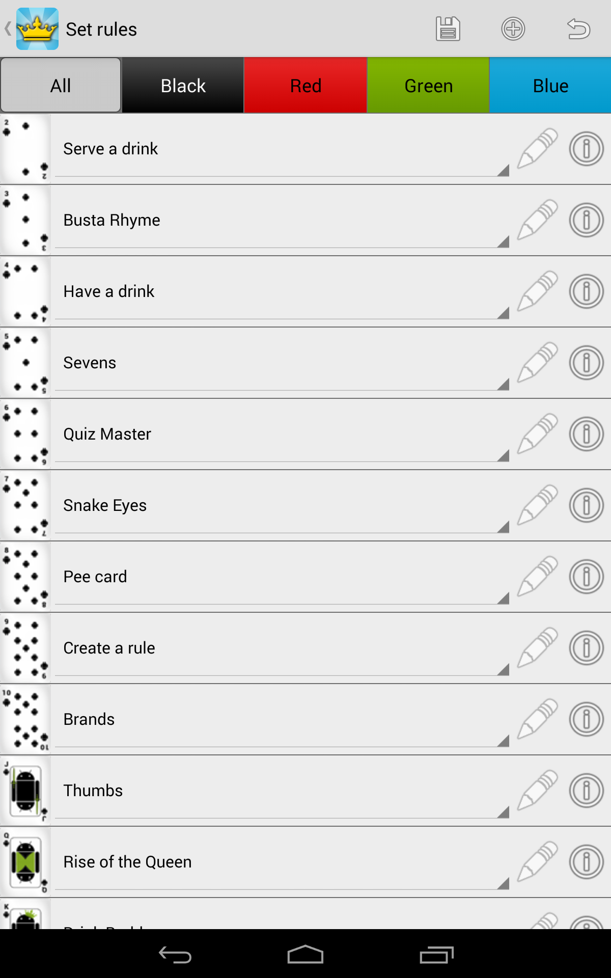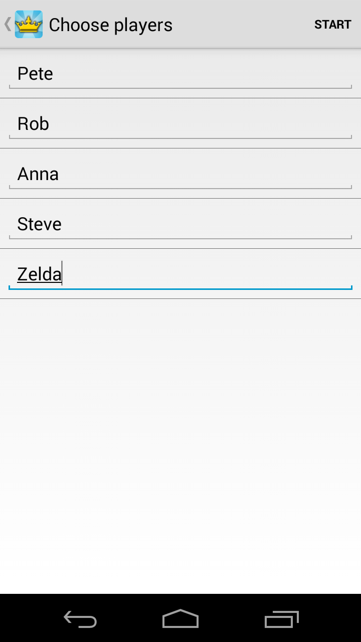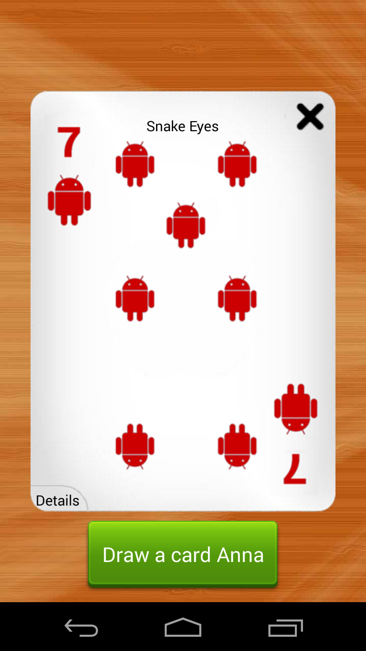 Kings for Android is the classic booze game brought back to life for your drinking pleasure! Compete with your friends using a single device! Simply enter the names of all the contestants, possibly edit the rules of the game, and start picking cards. For those who never heard of Kings, the game is based on a deck of cards. Every turn someone has to pick a card and perform the action that corresponds to this card (found on the back). All actions are related to taking a zip of booze so be prepared for a fun night!